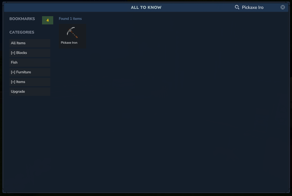 Never wonder where to find an item again with ATK (All To Know), an interactive item encyclopedia for Hytale. Browse all game items, view crafting recipes, see exactly how to obtain anything, and explore content from installed mods.