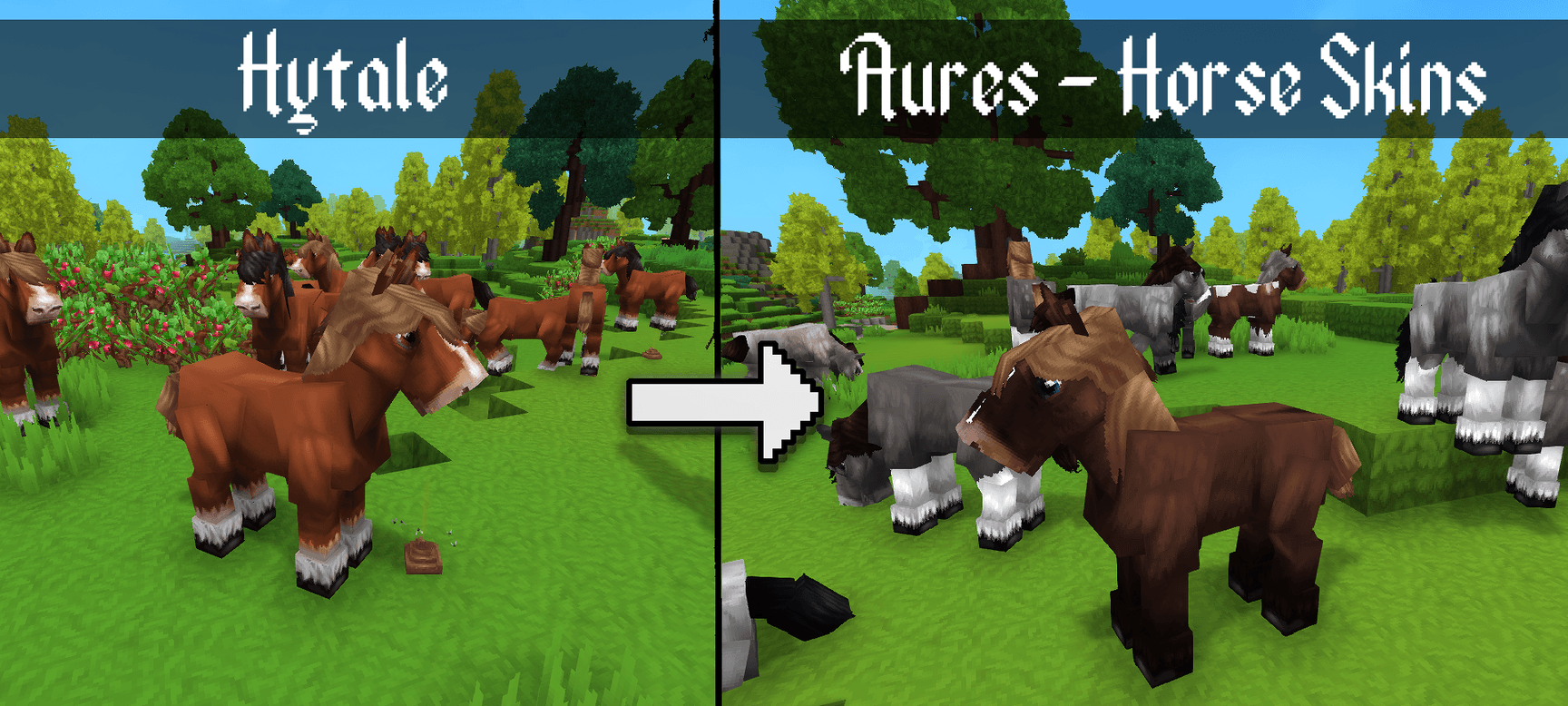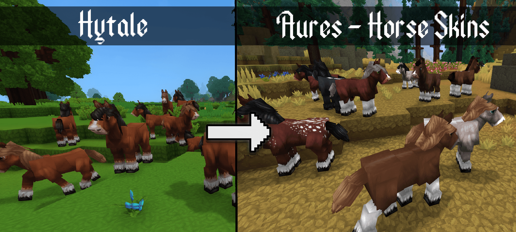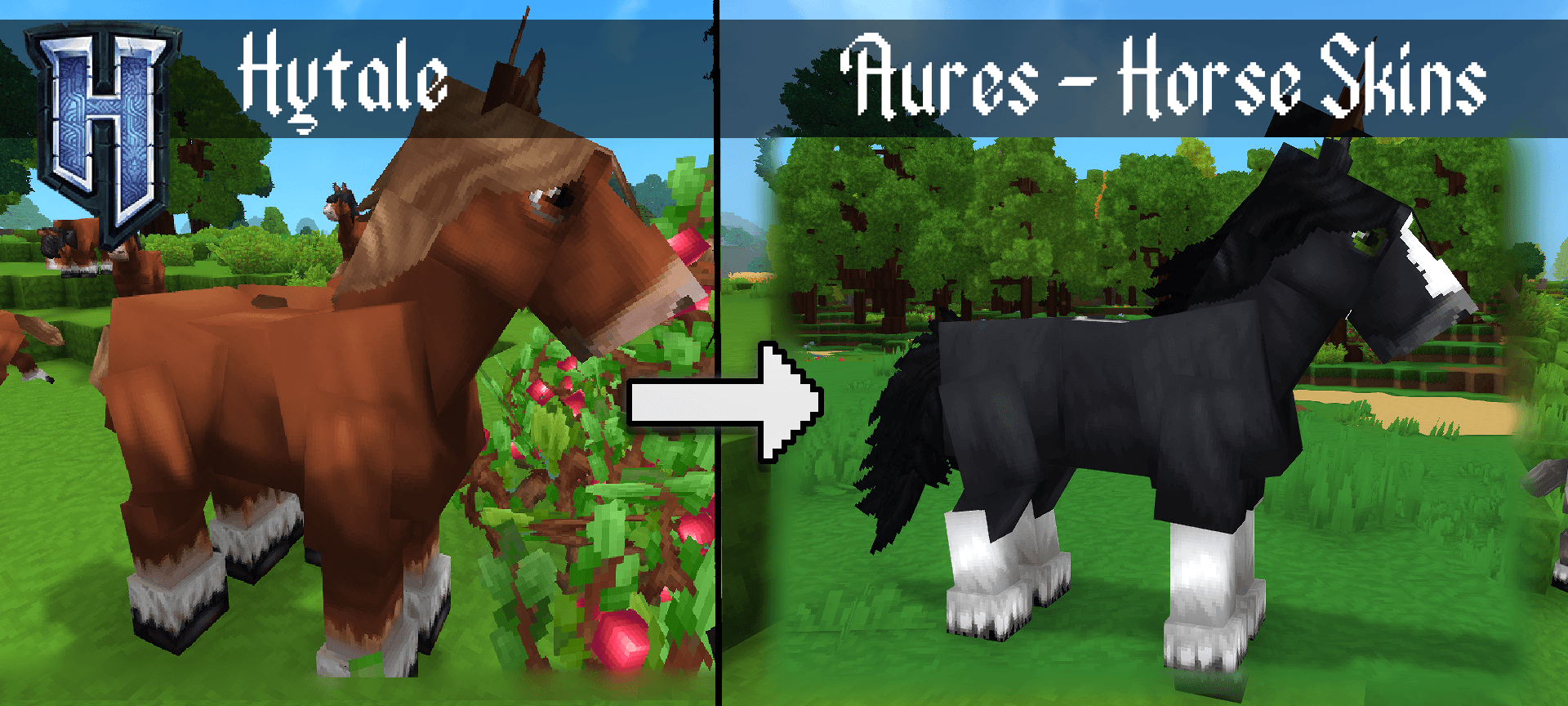 Aures - Horse Skins dramatically expands horse variety in Hytale with 64 unique skin combinations. Created by BlackAuresArt (Violet), this mod also adds custom animations for more lifelike horse behavior.