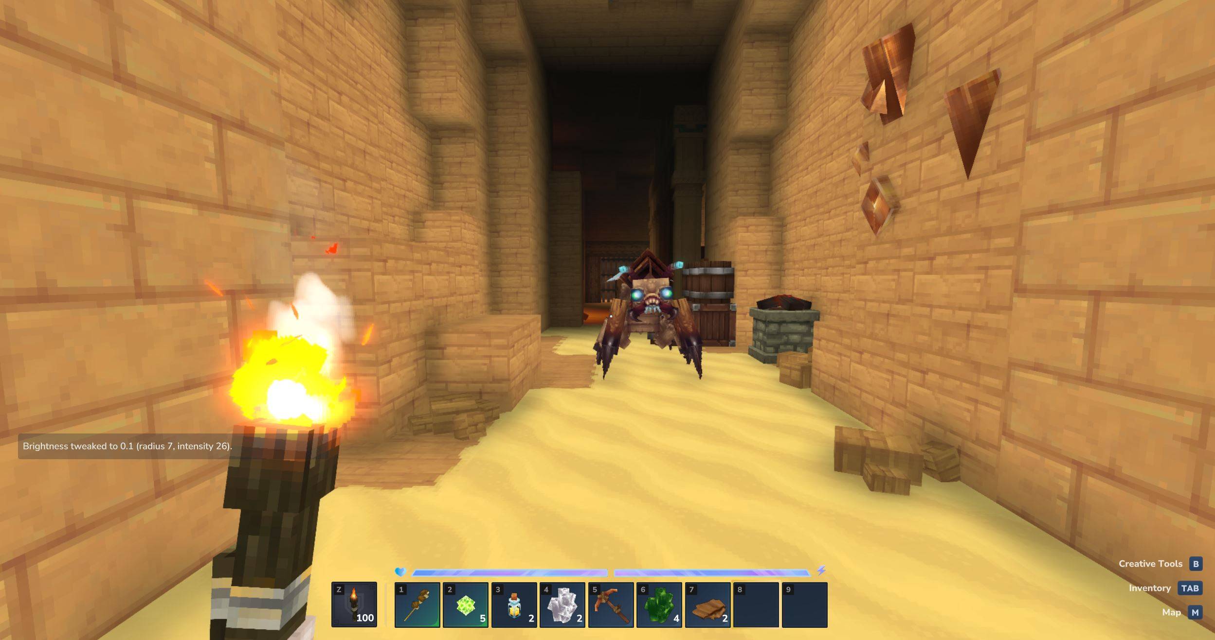 Exploring caves and fighting at night becomes much easier when you can actually see. Brightness Tweaks adds dynamic lighting around your character when you carry a torch in your utility belt.