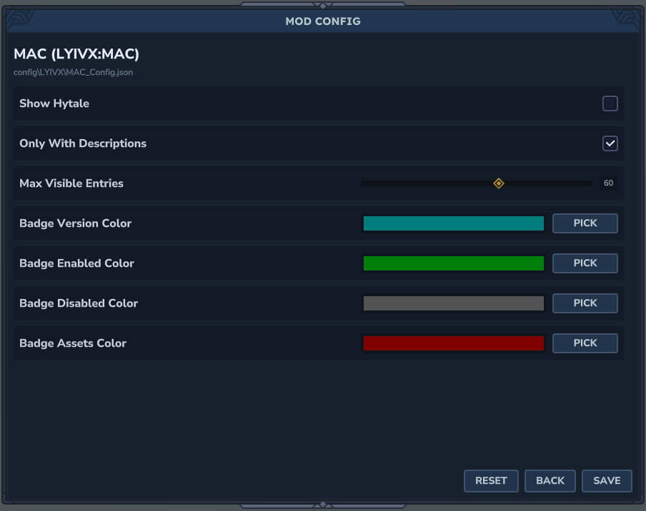 MAC reads config schemas registered in code and generates config files automatically. Other mods can hook into MAC with a simple registration call.
