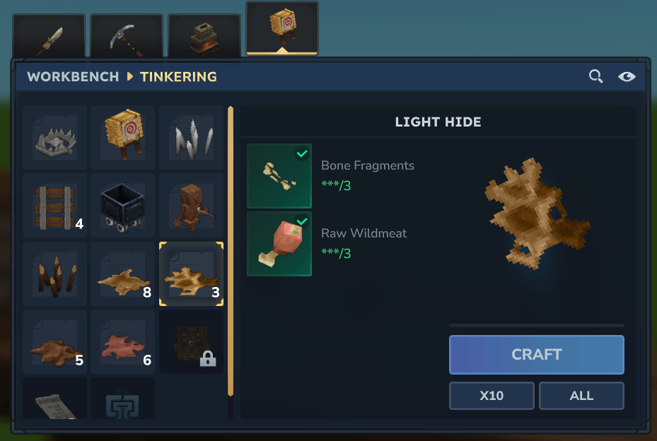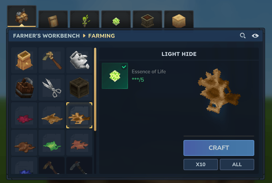 New crafting recipes to obtain hide and leather without hunting specific animals. Convert raw meat and bones or life essence into various hide tiers.